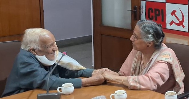 मैं और मोहित तुरंत निकले और रास्ते में से कॉमरेड दिनेश वार्ष्णेय, कॉमरेड भालचंद्र कानगो, कॉमरेड गिरीश, कॉमरेड रामशरण जोशी, कॉमरेड अर्जुमंद, कॉमरेड अनिल राजिमवाले, कॉमरेड महेश राठी आदि को सूचित किया। विश्वनाथ जी के घर पहुँचने पर डॉ. अभय भी आ गए और डॉ. ओम भी अपने एक साथी विद्यार्थी के साथ पहुँच गए। जब उन्हें लेकर हम सब अजय भवन पहुँचे तो कॉमरेड डी. राजा भी कार्यालय में मौजूद होने से विश्वनाथ त्रिपाठी जी से मिलने के लिए आये। त्रिपाठी जी ने खड़े होकर कॉमरेड राजा के हाथों को अपनी आँखों से लगाकर अपनी पार्टी के महासचिव के प्रति अपना सम्मान प्रकट किया। फिर तो यादों की बारात चल निकली। विश्वनाथ जी ने कहा कि मैं अजय भवन के उद्घाटन के वक़्त मौजूद था और मुझे कॉमरेड डांगे और कॉमरेड राजेश्वर राव के भाषण भी याद हैं। उन्होंने स्मृति से उन भाषणों के अंश सुनाये भी। उन्होंने कहा कि उस ज़माने में किरोड़ीमल कॉलेज को शॉर्ट फ़ॉर्म में के. एम. यानि कार्ल मार्क्स कॉलेज कहा जाता था। वे कॉमरेड फ़ारुक़ी, कॉमरेड प्रेम सागर गुप्ता, कॉमरेड शमीम फ़ैज़ी, कॉमरेड नजमा, और तमाम पुराने बिछड़ चुके दिल्ली के कॉमरेडों को याद करते रहे। कॉमरेड अमरजीत और कॉमरेड दिनेश वार्ष्णेय के विद्यार्थी राजनीति में सक्रियता के दौर से लेकर बहुत-सी बातें उन्होंने याद कीं। कॉमरेड महेश राठी और कॉमरेड कृष्णा झा को पहचानते ही उनकी आँखों में पुरानी पहचान और स्नेह उभर आया। उनकी याददाश्त का आलम यह था कि दशकों बाद मिले कॉमरेड गिरीश को पहचानकर उन्होंने उनके अलीगढ़ मुस्लिम यूनिवर्सिटी के संस्कृत के गुरू रहे प्रोफ़ेसर राम सुरेश त्रिपाठी को भी सम्मान के साथ याद किया। कॉमरेड डॉ. भालचंद्र कानगो से मिलकर वे इसलिए भी बहुत खुश हुए कि भारत में प्रगतिशील साहित्य के प्रकाशन का पर्याय रहे पीपुल्स पब्लिशिंग हाउस को अब वे नेतृत्व दे रहे हैं। कॉमरेड डी. राजा ने कहा कि आपके होने से हमें संबल भी मिलता है और प्रेरणा भी। आप आये, आप पार्टी के सदस्य हैं – यह हम सबके लिए गौरव की बात है। विश्वनाथ जी की आँखों की कोरों पर हल्की नमी दिखायी दी।