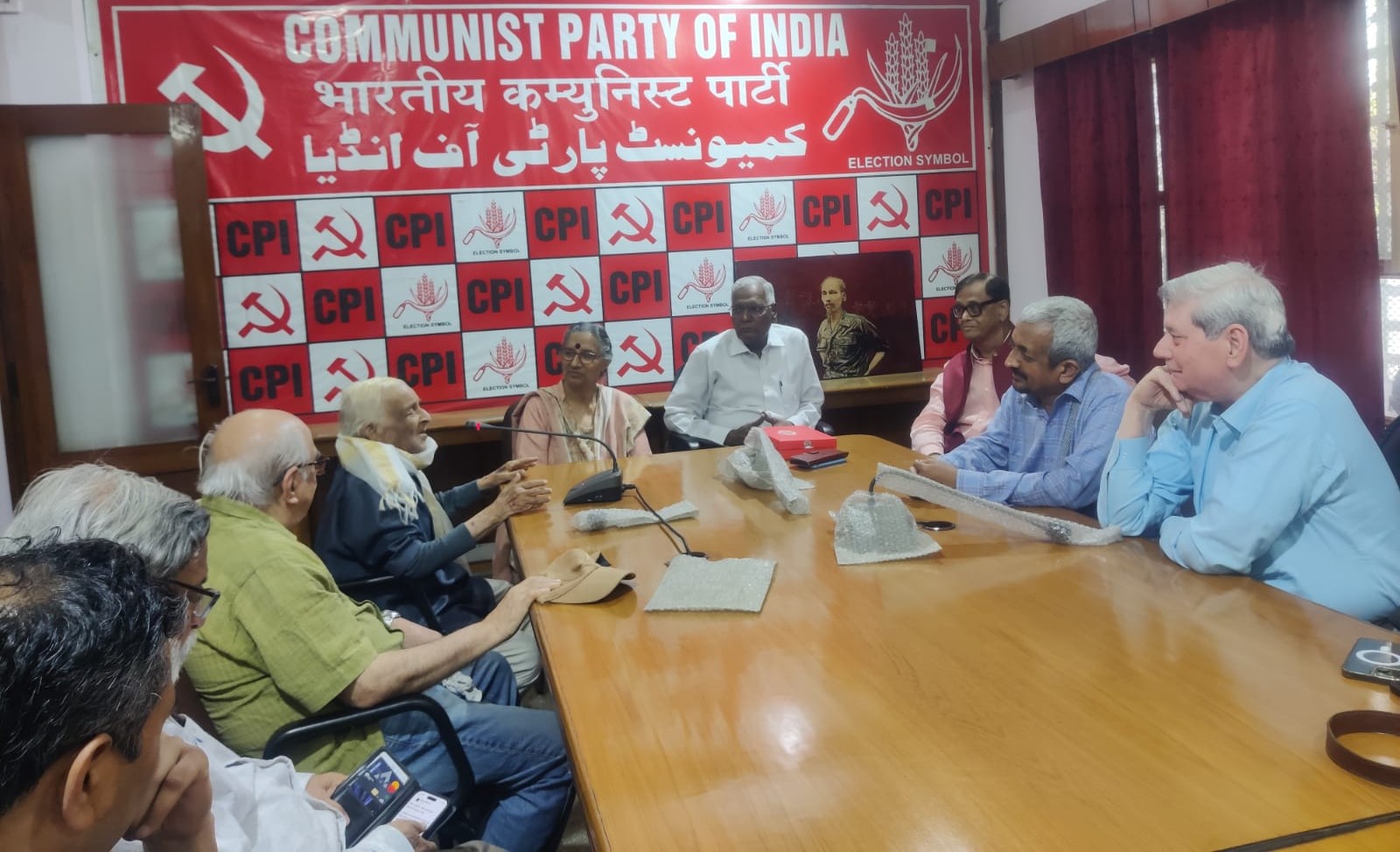 मैं और मोहित तुरंत निकले और रास्ते में से कॉमरेड दिनेश वार्ष्णेय, कॉमरेड भालचंद्र कानगो, कॉमरेड गिरीश, कॉमरेड रामशरण जोशी, कॉमरेड अर्जुमंद, कॉमरेड अनिल राजिमवाले, कॉमरेड महेश राठी आदि को सूचित किया। विश्वनाथ जी के घर पहुँचने पर डॉ. अभय भी आ गए और डॉ. ओम भी अपने एक साथी विद्यार्थी के साथ पहुँच गए। जब उन्हें लेकर हम सब अजय भवन पहुँचे तो कॉमरेड डी. राजा भी कार्यालय में मौजूद होने से विश्वनाथ त्रिपाठी जी से मिलने के लिए आये। त्रिपाठी जी ने खड़े होकर कॉमरेड राजा के हाथों को अपनी आँखों से लगाकर अपनी पार्टी के महासचिव के प्रति अपना सम्मान प्रकट किया। फिर तो यादों की बारात चल निकली। विश्वनाथ जी ने कहा कि मैं अजय भवन के उद्घाटन के वक़्त मौजूद था और मुझे कॉमरेड डांगे और कॉमरेड राजेश्वर राव के भाषण भी याद हैं। उन्होंने स्मृति से उन भाषणों के अंश सुनाये भी। उन्होंने कहा कि उस ज़माने में किरोड़ीमल कॉलेज को शॉर्ट फ़ॉर्म में के. एम. यानि कार्ल मार्क्स कॉलेज कहा जाता था। वे कॉमरेड फ़ारुक़ी, कॉमरेड प्रेम सागर गुप्ता, कॉमरेड शमीम फ़ैज़ी, कॉमरेड नजमा, और तमाम पुराने बिछड़ चुके दिल्ली के कॉमरेडों को याद करते रहे। कॉमरेड अमरजीत और कॉमरेड दिनेश वार्ष्णेय के विद्यार्थी राजनीति में सक्रियता के दौर से लेकर बहुत-सी बातें उन्होंने याद कीं। कॉमरेड महेश राठी और कॉमरेड कृष्णा झा को पहचानते ही उनकी आँखों में पुरानी पहचान और स्नेह उभर आया। उनकी याददाश्त का आलम यह था कि दशकों बाद मिले कॉमरेड गिरीश को पहचानकर उन्होंने उनके अलीगढ़ मुस्लिम यूनिवर्सिटी के संस्कृत के गुरू रहे प्रोफ़ेसर राम सुरेश त्रिपाठी को भी सम्मान के साथ याद किया। कॉमरेड डॉ. भालचंद्र कानगो से मिलकर वे इसलिए भी बहुत खुश हुए कि भारत में प्रगतिशील साहित्य के प्रकाशन का पर्याय रहे पीपुल्स पब्लिशिंग हाउस को अब वे नेतृत्व दे रहे हैं। कॉमरेड डी. राजा ने कहा कि आपके होने से हमें संबल भी मिलता है और प्रेरणा भी। आप आये, आप पार्टी के सदस्य हैं – यह हम सबके लिए गौरव की बात है। विश्वनाथ जी की आँखों की कोरों पर हल्की नमी दिखायी दी।